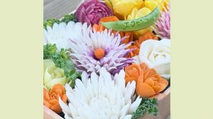 スイカを中心に、様々な果物や野菜で模様やお花を彫刻します。